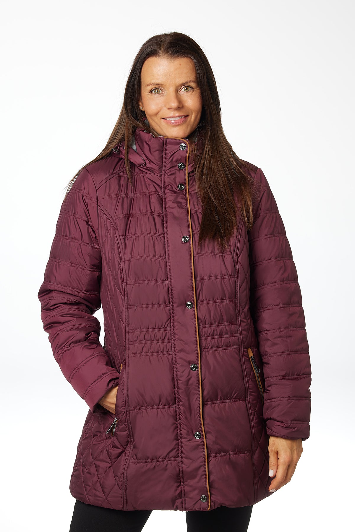 Denne quiltede damejakke fra Danwear er dejlig at bevæge sig i og overbeviser samtidigt med skandinavisk design. Høj kvalitet forenes med et langt snit, trykknaplukning og lynlås, der kan lukkes højt op i halsen. Kraven og den justerbare, aftagelige hætte er foret med lækkert, ekstra blødt stof. Der findes mange eksklusive detaljer som alcantara pipings på kanter og ved lynlåse. Jakkens lommer er med lynlås og fleece i, den er med vindstop i ærmerne, er fremstillet af 100% genanvendt polyester og har en vand og vindafvisende imprægnering. En jakke man ikke kan undvære.